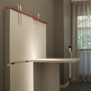 - L'esigenza di avere una cucina funzionale “custom made” ed il supporto di un tavolo, anch'esso realizzato su misura, in grado di chiudersi totalmente a muro o, all'occorrenza, di aprirsi parzialmente o completamente, a seconda delle necessità di impiego dei Committenti.